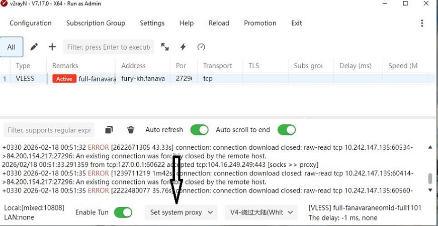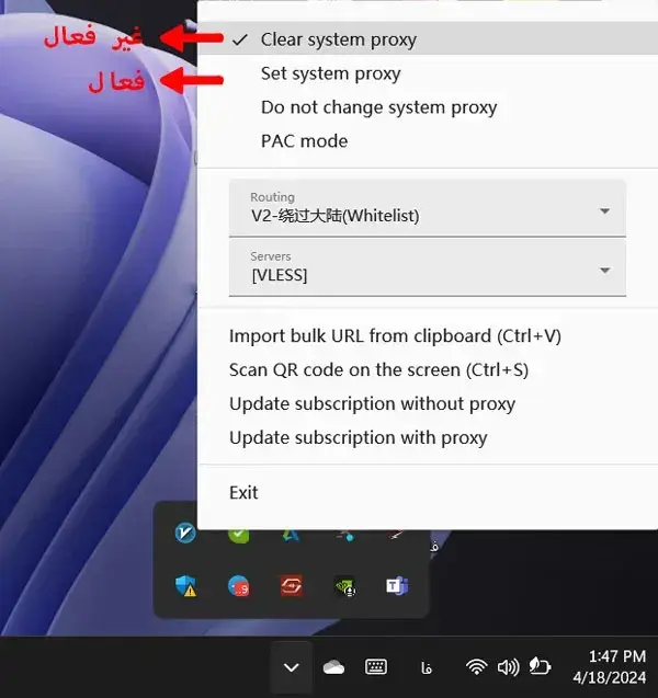 مطمئن شوید آیکون V در نوار ابزار پایین سمت راست (Taskbar) سبز شده است. برای فعالسازی کامل، روی آیکون راست کلیک کرده، گزینه System Proxy را روی Set System Proxy قرار دهید.