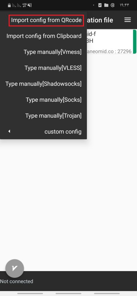 1- در قسمت بالا علامت + (به اضافه) را بزنید . (درست مثل قسمت اول آموزش)سپس Import Config From QR Code را انتخاب کنید.
