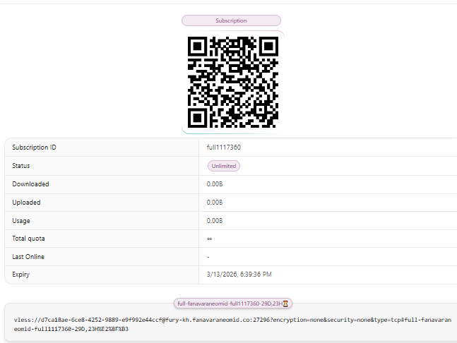 – همچنین QR Code قرار داده شده که با اسکن آن، کانفیگ بهصورت خودکار ایمپورت میشود